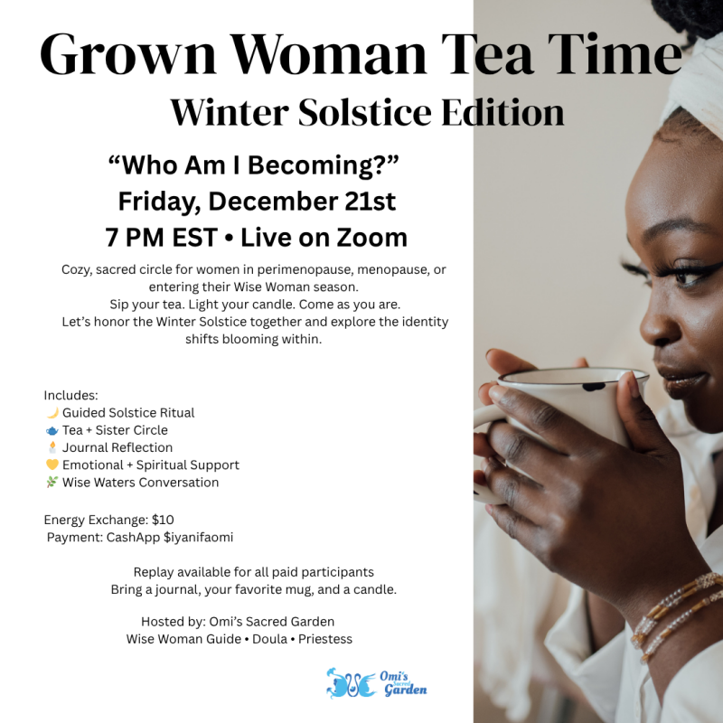Founded by Omitola Yejide Fowler, Priestess of Yemoja, Doula, Healer, and Educator, Omi’s Sacred Garden weaves the sacred with the practical: herbal medicine, full-spectrum doula care, energy healing, ceremony, and teaching. Whether you come seeking womb wellness, postpartum support, or spiritual mentorship, every offering is created with reverence for your unique journey.